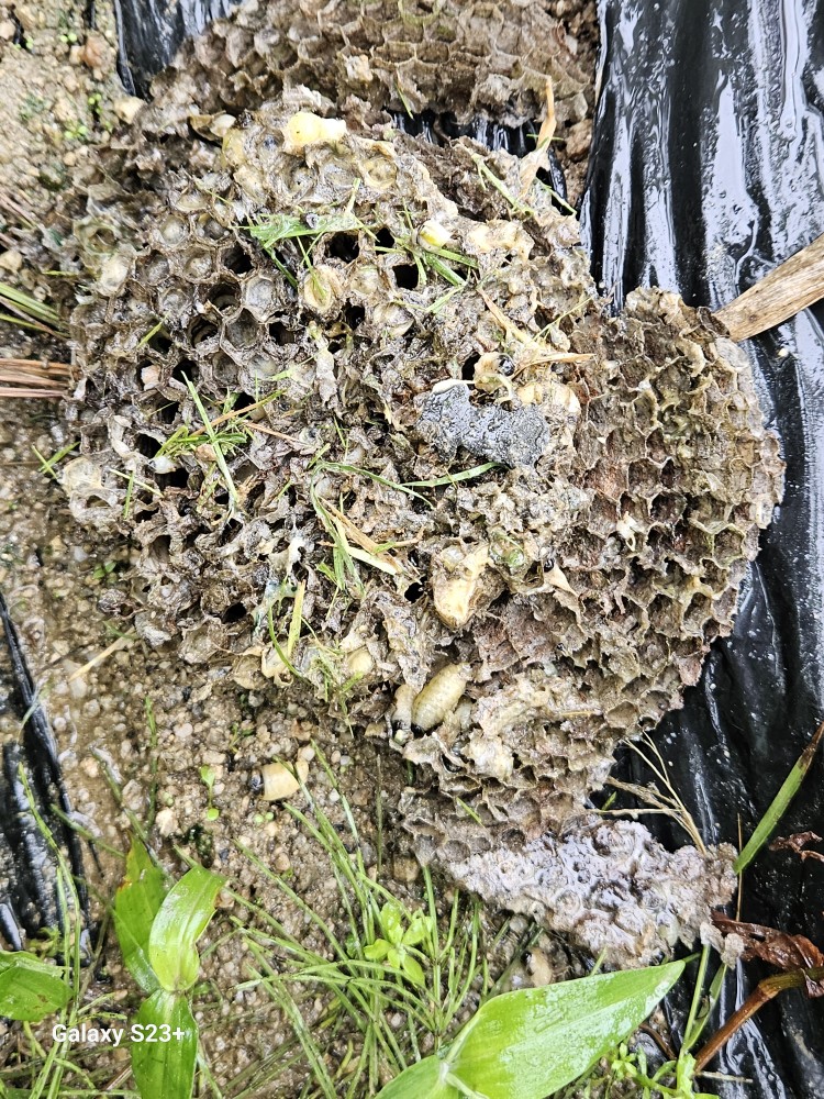 내가 장비도 없이 다가서냐고 물으니 말벌 종류 중 그리 독한 종이 아니어서 문제 없다고 한다. 벌집을 떼내어 발로 뭉개더니 밭으로 집어 던졌다. 내가 가서 보니 애벌레가 보였다.  더 급한 일도 많으신데 이런 일로 불러 대단히 미안하다고 했더니 절대 그렇지 않다고 말한다. 우리나라 소방관 최고다!!