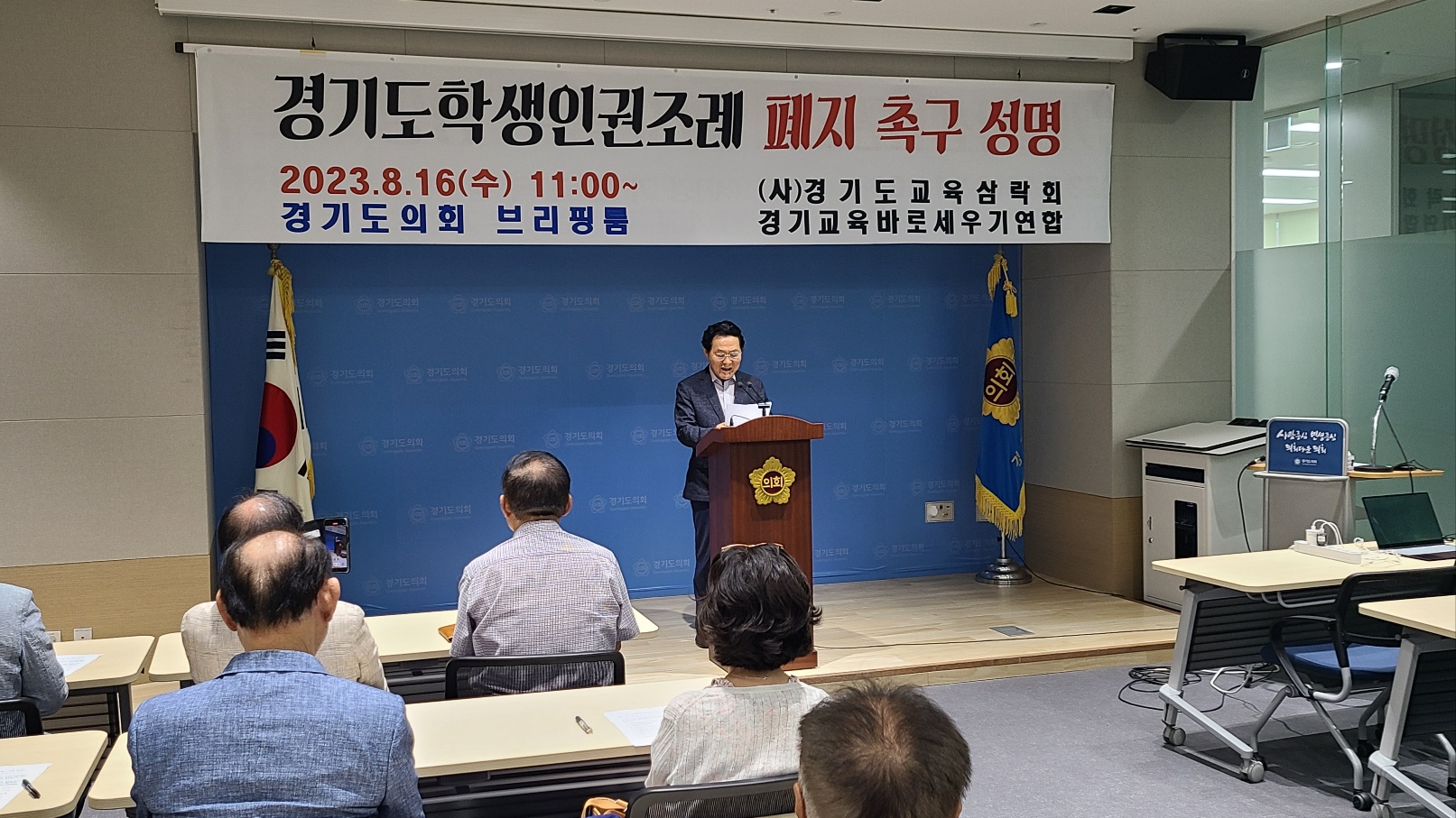 오늘 경기도의회 기자회견장에서 경기도학생인권조례 폐지를 촉구하는 경기삼락회의 기자회견이 있었다. 삼락회 회장이 인삿말을 하고 이어 내가 경기도학생인권조례 폐지를 촉구하는  선언문을 낭독하였다.  선언문도 내가 직접 작성하였다. 서이초등학교 교사 자살 사건을 계기로 전국에서 추락한 교권을 회복해야한다는 목소리가 들불처럼 번지고 있는 이 때에 교실 붕괴를 더 이상 보고있을 수 없어 조국을 구하겠다는 피끓은 심정으로 나섰다.