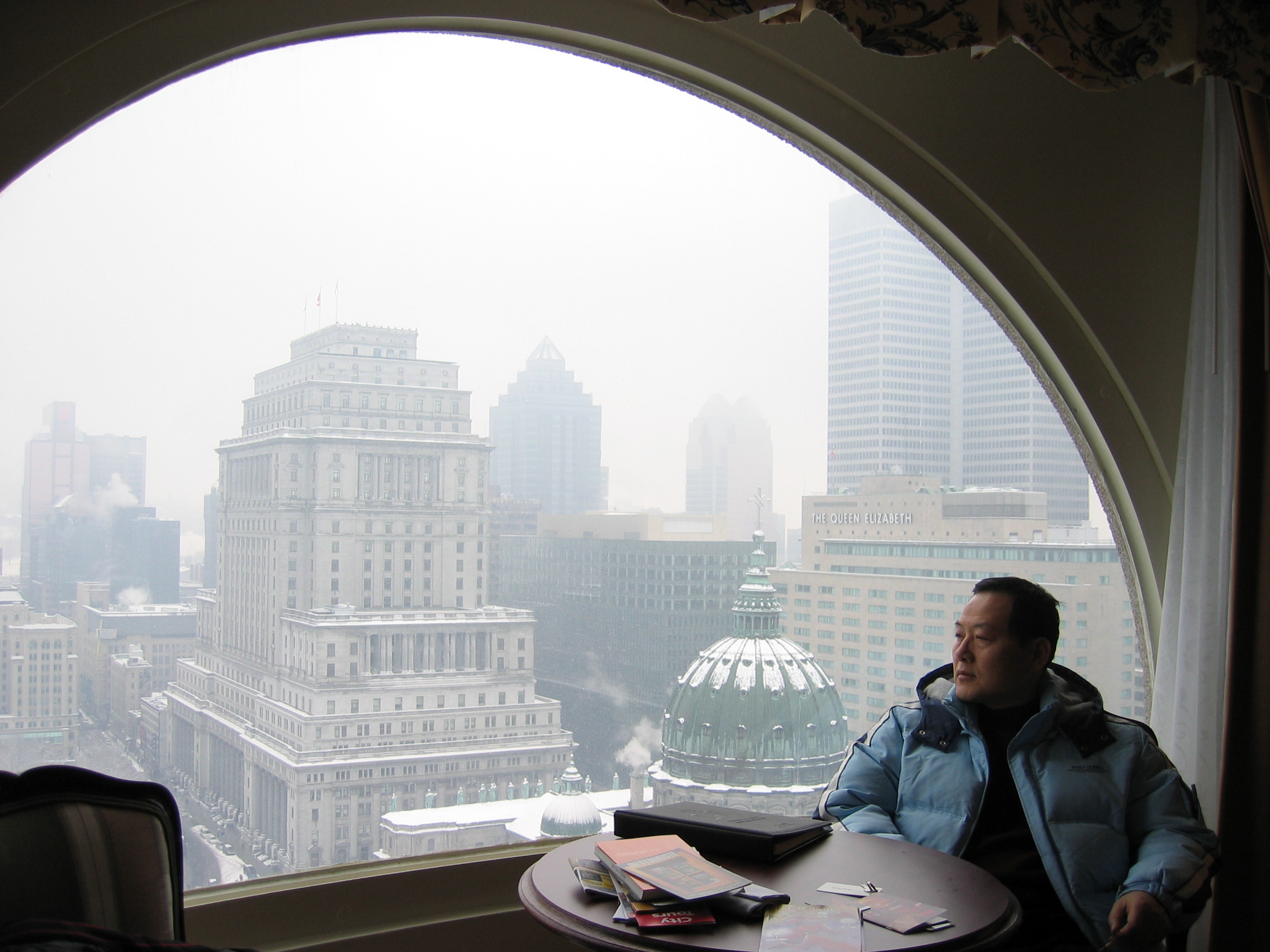 마천루 처럼 높은 마리어트 호텔의 창에 앉아 밖을 내다보니