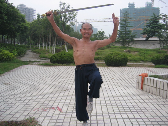 조깅 시작할 때 공원에서 검을 갖고 운동하는 노인을 보았다.
