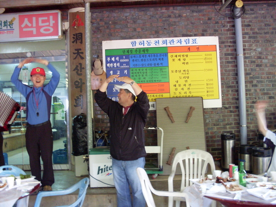 험허동천 음식점에서 먹고 마셨다. 오락시간 중 ㅎㅎㅎ~