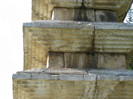 돌을 매우크게 잘라 쌓고 지붕돌 낙수면을 전탑처럼 층급을 둔것이다.