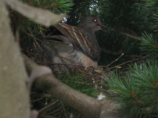 교육원 정원의 5엽송에 비둘기 한마리가 알을 품고 있다.