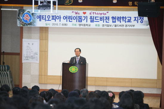 이에 우리 영덕중학교 학생들이 에티오피아 어린이들과 결연을 맺어 도와줌으로써 우리의 민주주의와 자유를 위해 죽어간 에티오피아 젊은이들의 참된 죽음에 보답하고 그들의 숭고한 뜻을 기리는 일이 될 것입니다.