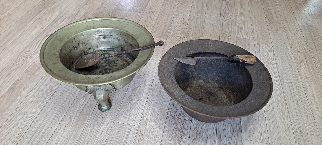 집에 가져와 마루에 놓고 보니 내 마음이 기쁘다. 왼 쪽이 오늘 구입한 백동화로이고 오른쪽이 주물화로이다. 백동화로 부젓가락은 제짝이 아니다.