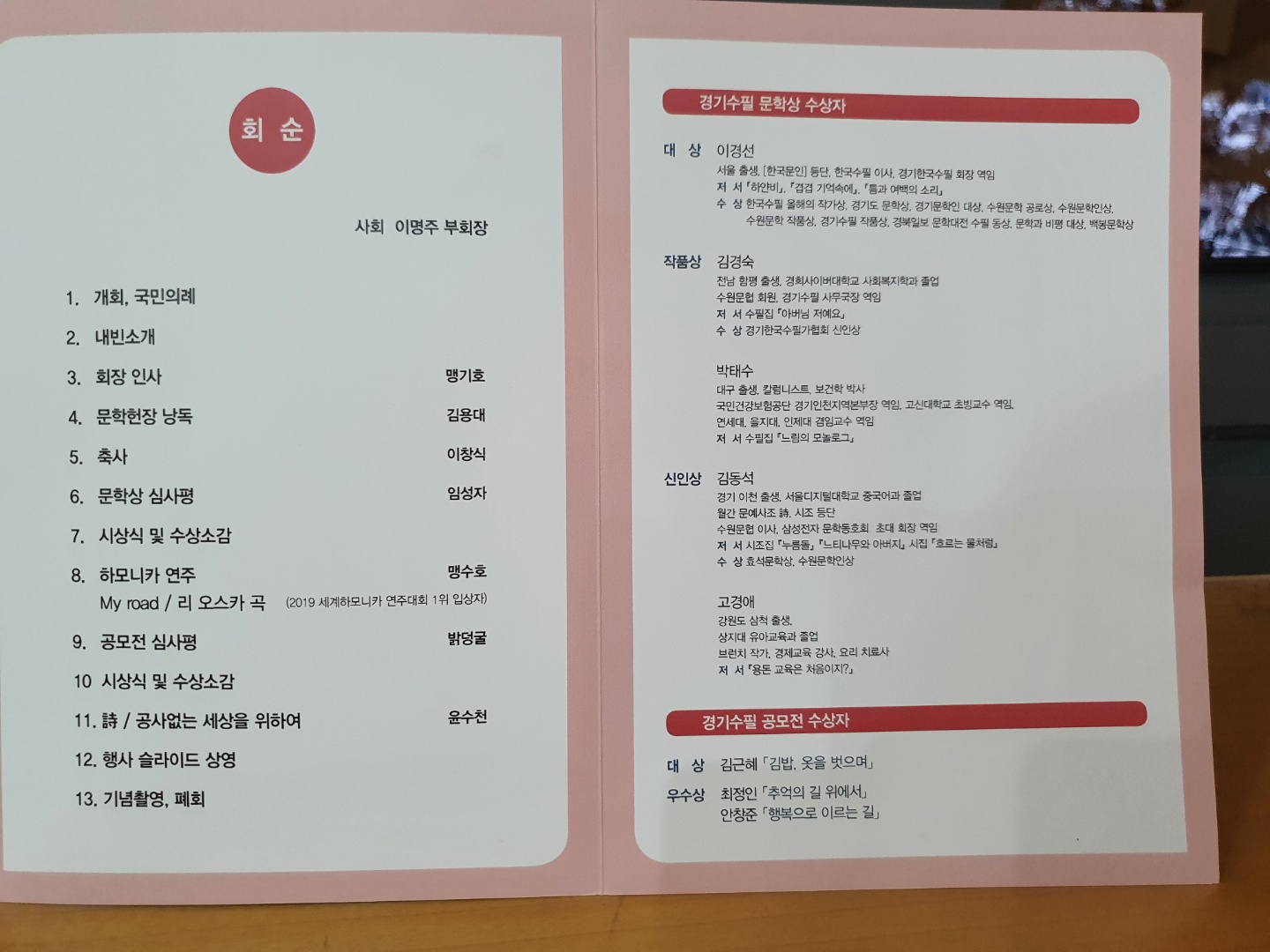 경기수필가협회 문학상 시상식 및 출판기념회가 열렸다. 금년에 내가 회장을 맡아 여러가지 사업을 계획하였으나 제대로 실천하지 못했다. 회장 인사말에서 이렇다할 성과를 내지 못한 것은 모두 회장의 능력부족으로 인한 것이니 머리숙여 용서를 구한다고 말했다.