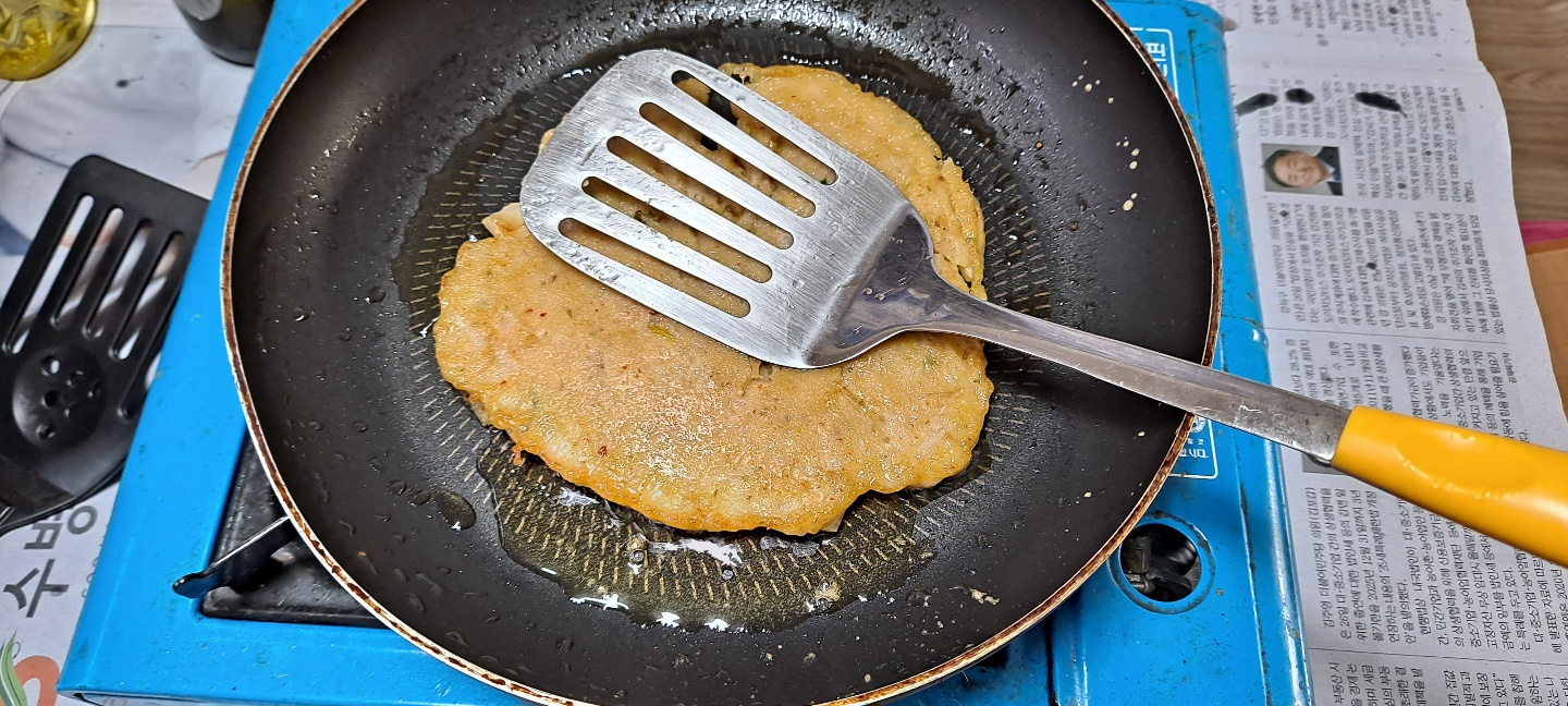 부치면서 즉석에서 먹는 맛이 최고다! 부치면서 한 장을 먹었고 소주를 곁들였다. 기분 좋다^^