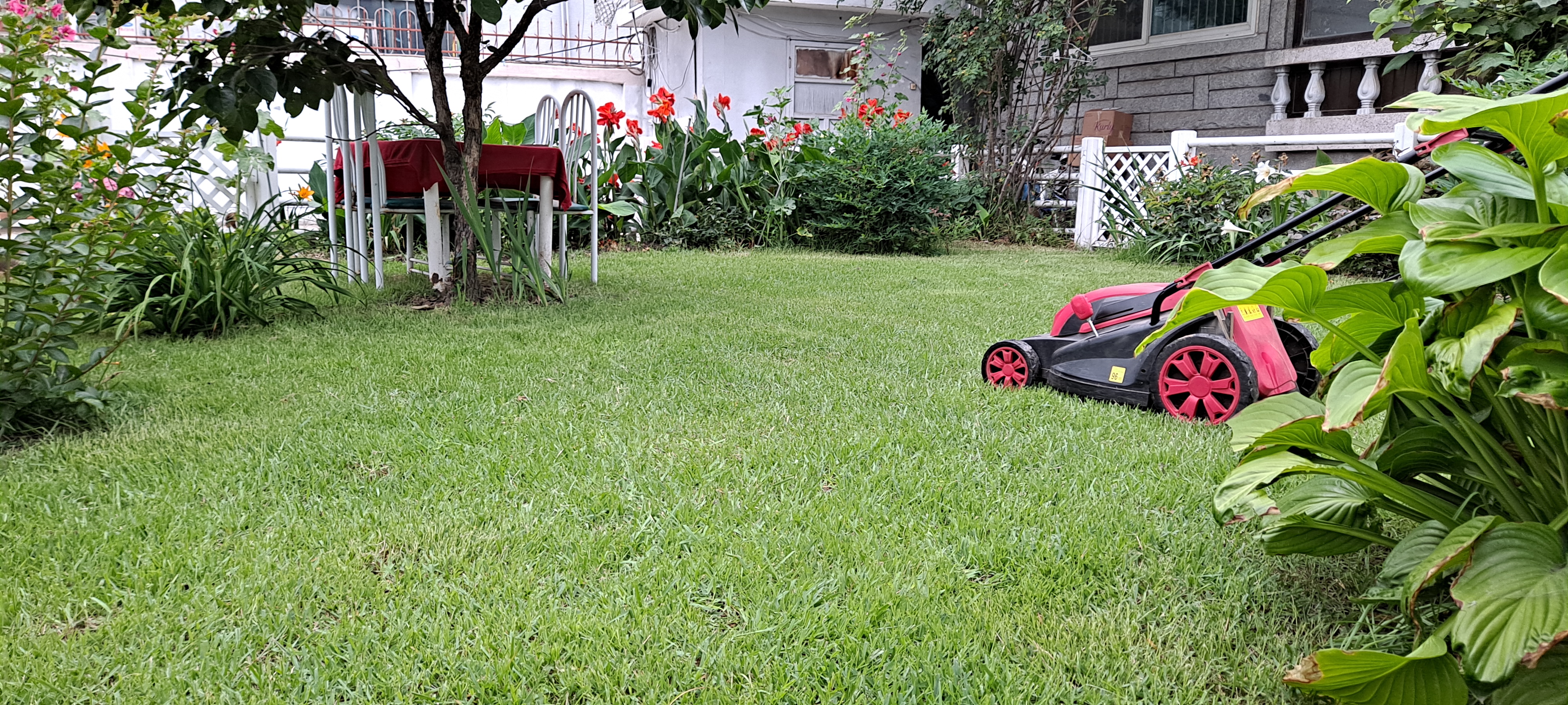 뜰에 잔디가 많이 자랐다. 오늘 금년 들어 두 번째 풀을 베었다. 잔디 깎는 기계가 중간에 말썽을 부려 애를 먹었다. 정확히는 연결 잭에 문제가 생겨서 중간에 멈췄다.