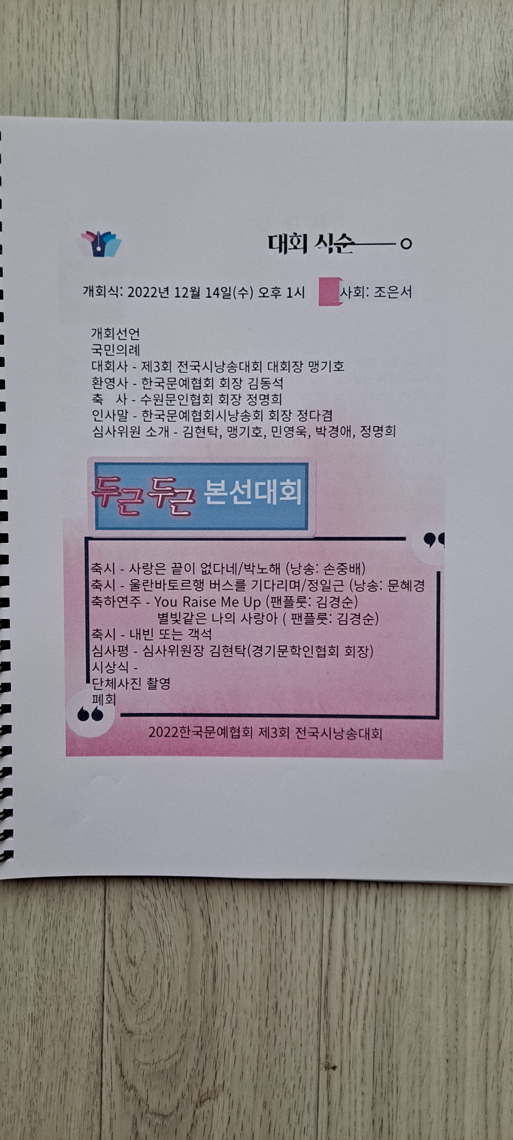 우리가 서로 경연을 벌이는 것도 중요하지만 이런 문화적 행사를 통해서 사회에 아름다운 마음을 일으키고 서로 정다운 마음을 나누게 하는 계기가 된다고 믿습니다. 거리에서, 골목에서, 카페에서, 공원에서 詩 읽는 소리가 넘쳐날 때 이웃과 사회는 더욱 낭만과 정이 넘치는 품격 높은 사회가 될 것입니다.