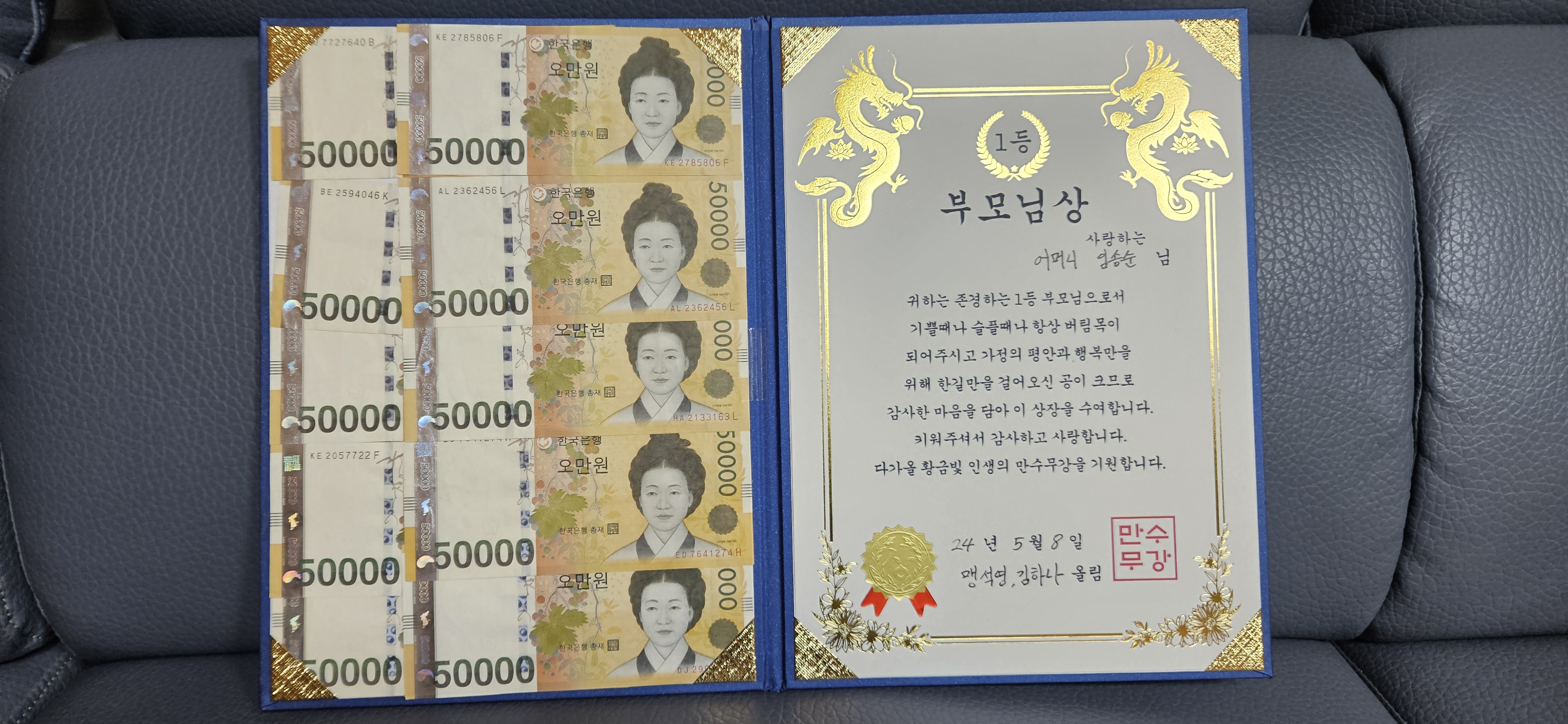 나는 처음부터 아버지께 100만 원 전액을 드렸다. “아버지 대통령께서 명절에 부모님 드리라고 돈을 보냈습니다.” 라고 말씀드렸더니 크게 놀라시면서 대통령께서! 공직자의 부모까지 생각해주신다고 고마워하셨다. 다음 명절부터는 대통령이 부모에게 주는 것이니 당연히 받는 것으로 아셨다. 그렇게 매년 설과 추석 때마다 30년을 드렸다.